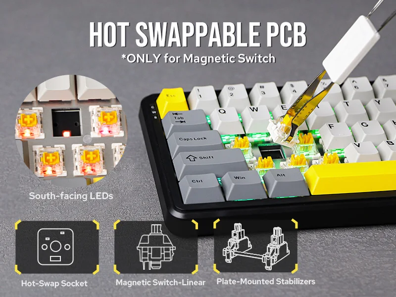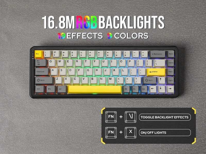Designed with a 68-key setup, the AK680 MAX custom keyboard includes all vital keys and minimizes its dimensions, resulting in improved portability and ergonomics. With its hot-swappable PCB, you can easily replace switches without any soldering, making your typing experience more convenient. Featuring the stunning south-facing RGB lighting and PBT premium keycaps, this keyboard balances visual appeal and practicality to suit your style and preferences. You can easily and conveniently diy the RGB lighting effects by FN combination keys or software.
